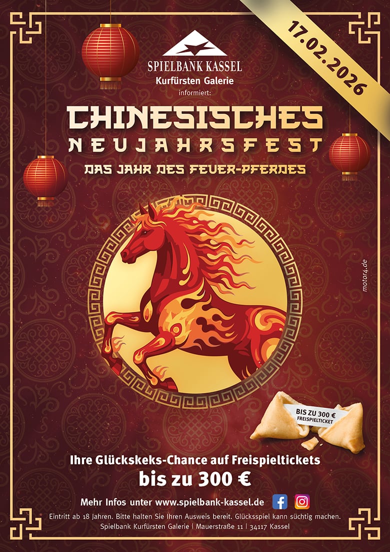 🎊 Save the date! Am Dienstag den 17.02.2026 feiern wir mit Ihnen das Chinesische Neujahrsfest. Jeder Gast bekommt einen Glückskeks mit der Chance auf ein Freispielticket bis zu 300 €. 🥠